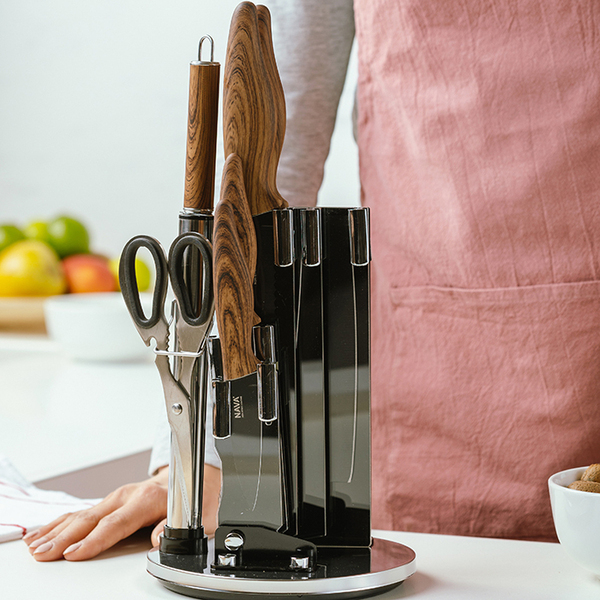 Κατασκευασμένα από ανοξείδωτο ατσάλι, με αντικολλητική επίστρωση stone, είναι εξαιρετικά ανθεκτικά και παραμένουν αιχμηρά στον χρόνο. Διαθέτουν εργονομικές λαβές για ακρίβεια και ταχύτητα στο κόψιμο, με αντιολισθητική επίστρωση με όψη ξύλου για άνετο και ασφαλή χειρισμό. Συνοδεύονται από περιστρεφόμενη ακρυλική βάση για την εύκολη και ασφαλή αποθήκευση των μαχαιριών.