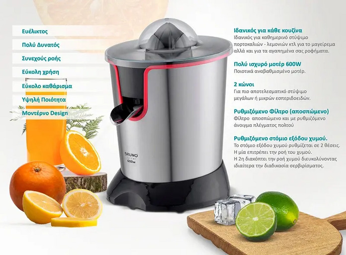 Διαθέτει πολύ ισχυρό μοτέρ 600W, 2 κώνους για πιο αποτελεσματικό στύψιμο μεγάλων ή μικρών εσπεριδοειδών και ρυθμιζόμενο στόμιο εξόδου χυμού 2 θέσεων.
