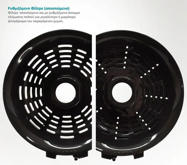Το φίλτρο διαχωρισμού του πολτού είναι αποσπώμενο για εύκολο καθάρισμα ενώ διαθέτει και ρυθμιζόμενο άνοιγμα πλέγματος για μεγαλύτερο ή μικρότερο φιλτράρισμα του παραγόμενου χυμού.