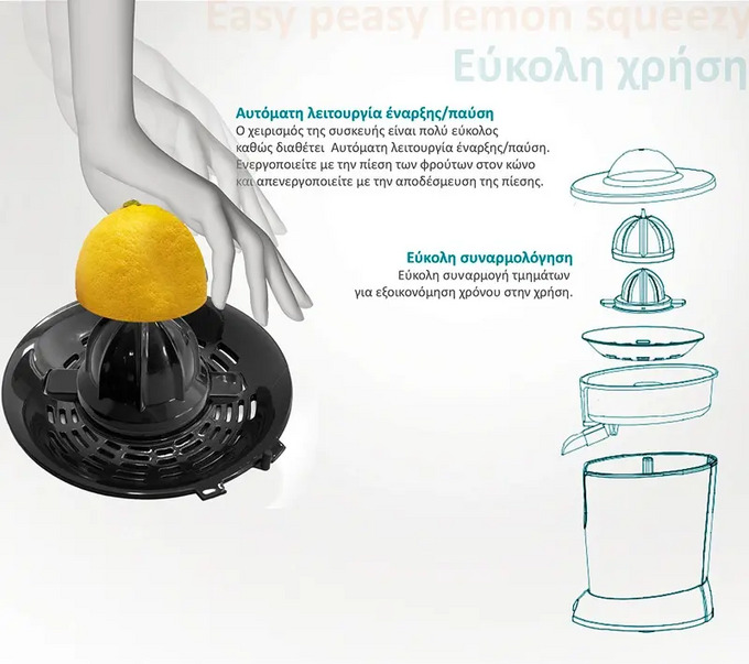 Ο χειρισμός της συσκευής είναι πολύ εύκολος καθώς διαθέτει αυτόματη λειτουργία έναρξης/παύσης, ενεργοποιείτε με την πίεση των φρούτων στον κώνο και απενεργοποιείτε με την αποδέσμευση της πίεσης.