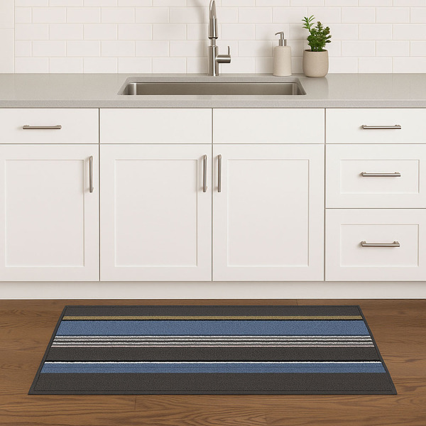 Διάδρομος με αντιολισθητική βάση TPR, σε αποχρώσεις του γκρι και του μπλε, με σχέδιο οριζόντιες ρίγες. Ιδανικός για χρήση μπροστά από τον νεροχύτη ή τον πάγκο εργασίας, προσφέρει άνεση στο περπάτημα και προστασία από ολισθήσεις.