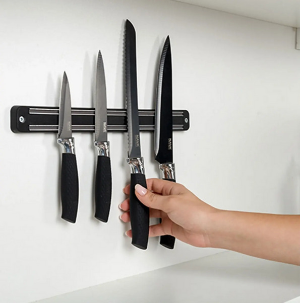 Ο επιτοίχιος μαγνήτης μαχαιριών Misty της NAVA κρατά οργανωμένα τα μαχαίρια σας, τακτοποιημένη την κουζίνα σας, εξοικονομεί χώρο στον πάγκο σας, κρατά τα μαχαίρια σας ασφαλή και σε σημείο μη προσβάσιμο στα παιδιά, ενώ ταυτόχρονα προσφέρει μία μοντέρνα νότα στη διακόσμηση της κουζίνας σας.