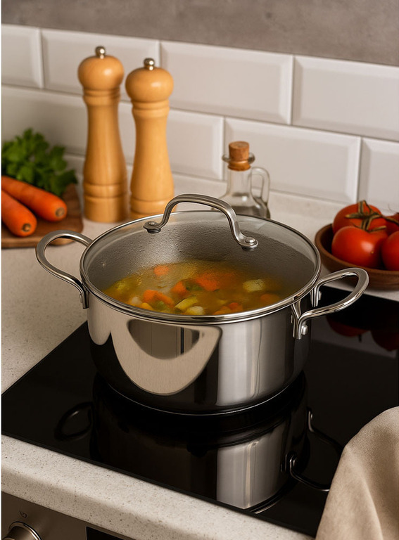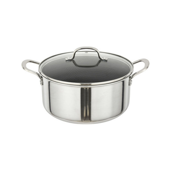 Κατσαρόλα από ανοξείδωτο ατσάλι 18/8 πάχους 2,5mm τριών στρώσεων με αντικολλητική επίστρωση. Διαθέτει γυάλινο καπάκι, είναι ανθεκτική στις γρατζουνιές και εξασφαλίζει ομοιόμορφη κατανομή θερμότητας. Κατάλληλη για όλες τις εστίες και για πλυντήριο πιάτων.