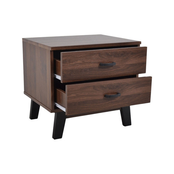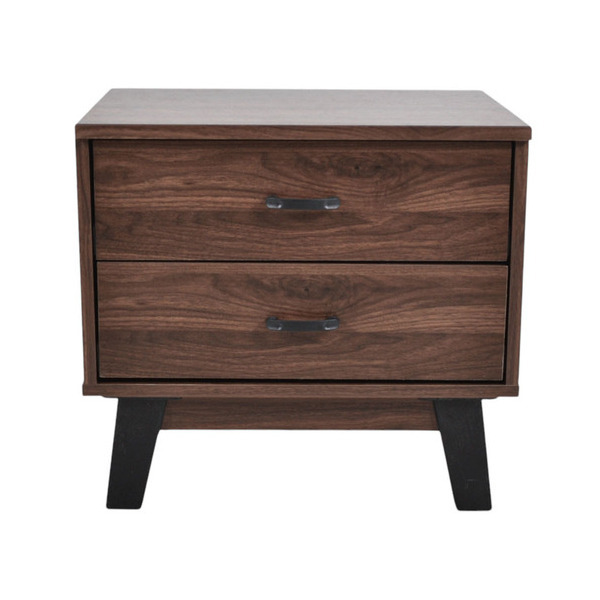 Κομοδίνο ξύλινο σε καρυδί χρώμα με δύο συρτάρια και κομψά πόδια σε μαύρο χρώμα.