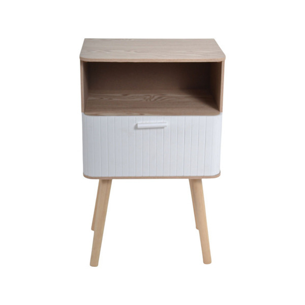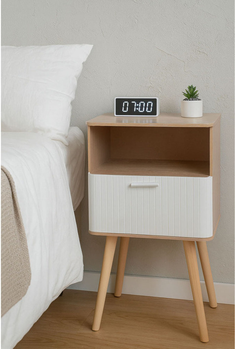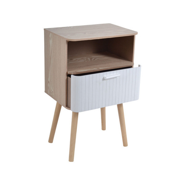 Κομοδίνο με ράφι και συρτάρι σε μοντέρνο σχεδιασμό, με επιφάνεια σε φυσική όψη ξύλου, λευκό μπροστινό μέρος με κάθετες γραμμώσεις και εργονομική λαβή. Ιδανικό για υπνοδωμάτιο, σαλόνι ή γραφείο, συνδυάζει πρακτικότητα και κομψότητα.