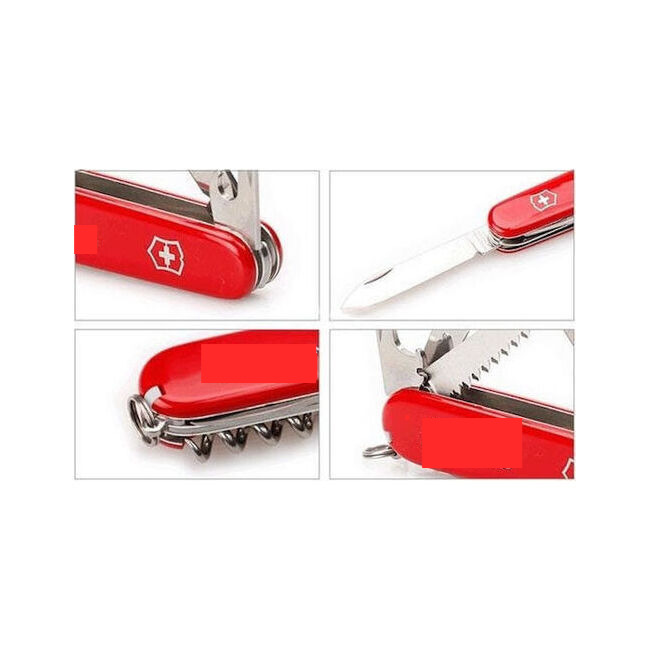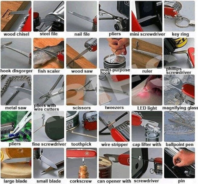 Μεγάλη λεπίδα / Μικρή λεπίδα / Τιρμπουσόν / Ανοιχτήρι κονσέρβας | Κατσαβίδι 3 mm / Ανοιχτήρι μπουκαλιών | Κατσαβίδι 6 mm | Απογυμνωτής καλωδίων / Εργαλείο διάτρησης, σουβλί και σακοράφα / Πριόνι ξύλου / Κρίκος μπρελόκ / Τσιμπιδάκι / Οδοντογλυφίδα